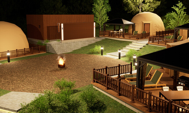 また、施設の真ん中にはファイヤーピットを設置。家族や仲間と焚き火を囲み、語り場として、活用いただけます。自然の中で思いっきり遊び、栄養たっぷりの食事でお腹が満たされた夜には、心が自然と開放され、普段はできない会話も生まれそうです。