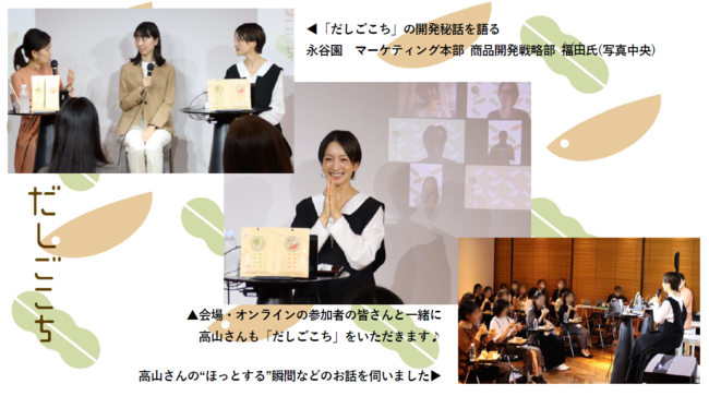 当日は、永谷園社員が語る「だしごこち」シリーズの開発秘話や、インフルエンサーの高山都さんの“ほっとする”お気に入り・好きなものについてのお話、試飲や試食などを通じて、本シリーズの目指す“心と体がほっとする”時間を参加者全員が一緒に体験できるイベントとなりました。