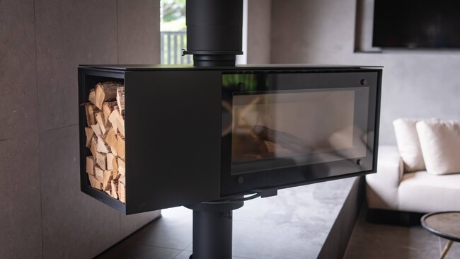 冬には世界最高峰の薪ストーブブランドのスキャンサームの薪ストーブが炎の揺らぎや色合い、薪の燃える音で心地よい時間を演出します。