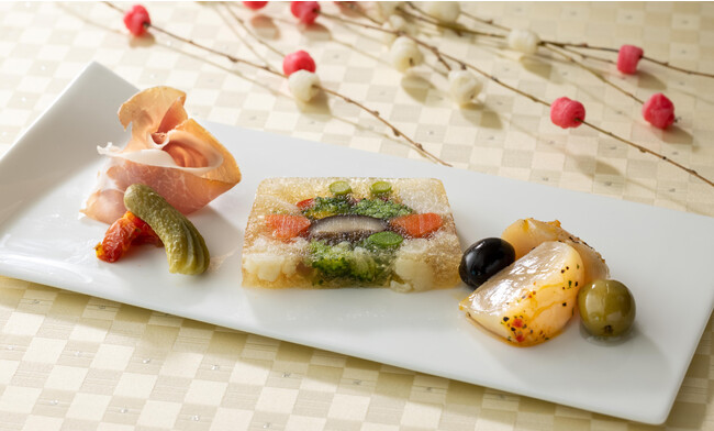 季節の野菜をコンソメゼリーでテリーヌにしました。