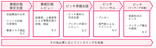 参加者のアイデアを具現化することを目的としたピッチ、メンタリング、 マッチング支援等のプログラムを実施いたします。