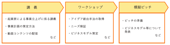 新事業創出に必要となる知識の習得、マインドセットの醸成等を目的に起業家等よる講義やワークショップ等に関するコンテンツを実施します。