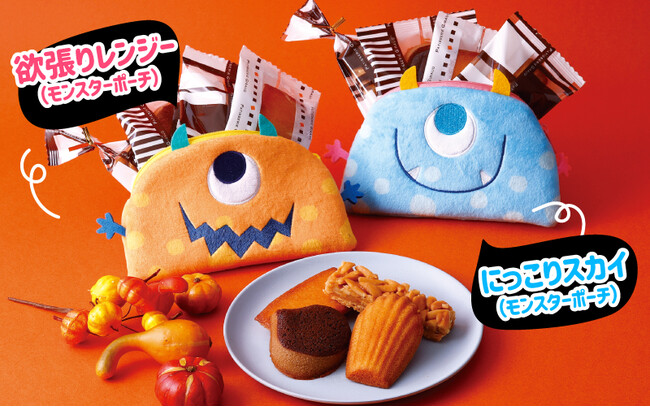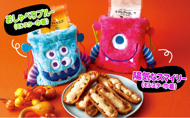 ハロウィン限定焼き菓子セットは2種類をご用意。ひとつは、選べるポーチにパティシエがひとつひとつ手作りで焼き上げる人気の定番焼き菓子セットが入った「モンスターポーチセット」900円(税込)。もうひとつは、選べる巾着に“お取り寄せスイーツ”として楽天人気ランキングのクッキー・焼き菓子部門で1位を獲得したオリジナル焼き菓子「エクレアラスク」が入った「モンスター巾着セット」950円(税込)。お好みのモンスターとスイーツに合わせてお選びください。