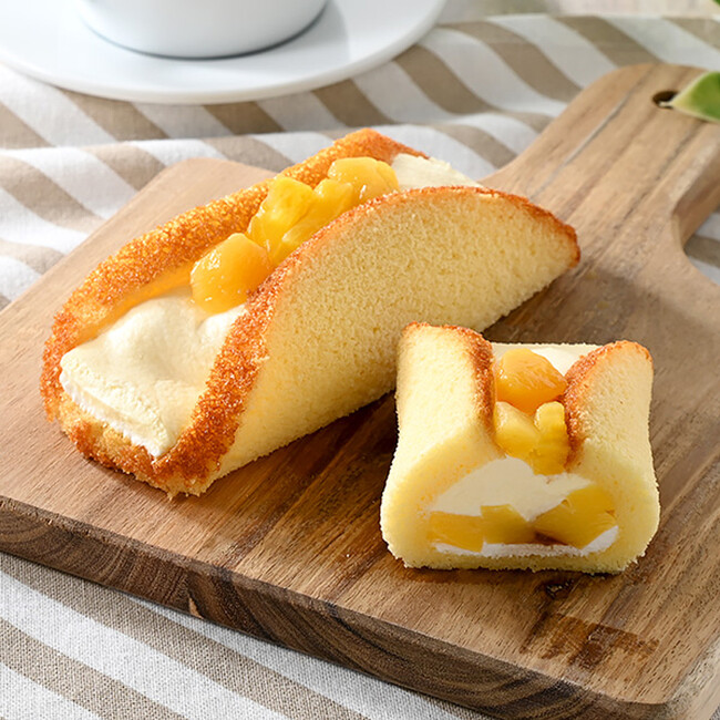 【特長】「プリンアラモード」をイメージしたオムレットです。プリン風味クリーム、プリン風ゼリー、カラメルソース、ホイップクリームをスポンジ生地で包みフルーツ(黄桃・パイン)をトッピングしました。