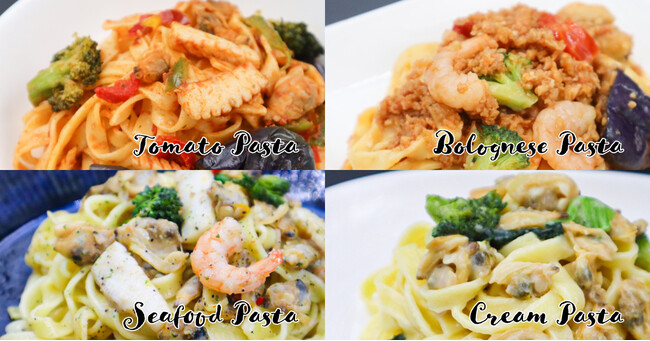 【内容・容量】アサリたっぷりのクリームパスタ350g、海鮮トマトパスタ350g、海鮮アヒージョ風パスタ300g、海老入りボロネーゼパスタ300g 各1食