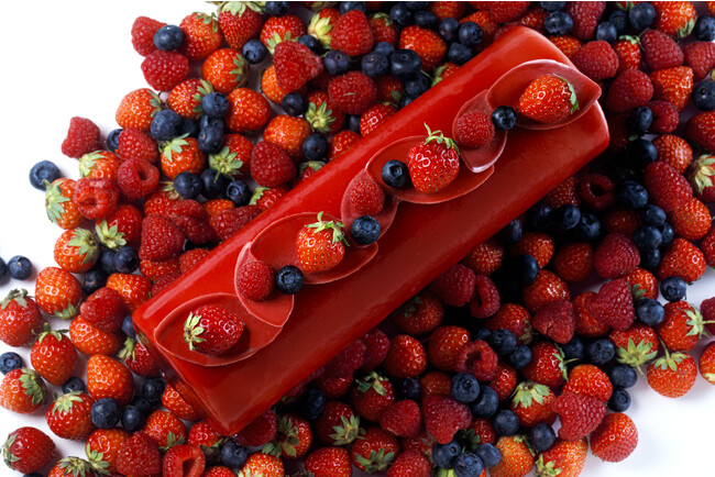 つややかなベリーの真紅が、ホリデーシーズンのテーブルに華やぎを添えて。ピスタチオのクリーム、ヴィエノワとフィナンシェの生地、ストロベリージャムをベリームースでつつみ、トップにあまおう苺、ラズベリー、ブルーベリーをあしらいました。切り分けたときに現れる赤と緑のクリスマスカラーにもシェフのエスプリが効いています。