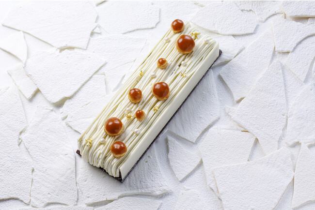 なめらかな栗のムースとクリームを、コルシカ島産クレモンティーヌのマーマレードとかけ合わせ、爽やかな柑橘のフレーバーが立ちのぼるマロンケーキに仕上げています。スパイスが香るシトラスクリーム、シナモン風味のヴィエノワで、クリスマススらしいフレーバーもプラス。フェスティブシーズンの食卓を照らすビビッドな色彩もアクセントに。