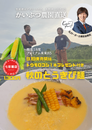 「圧倒的に美味しい麺」をブランドのアイデンティに掲げる「らーめん七彩飯店」(以下、七彩飯店)では、かいぶつ農園のプレミアム未来を使った「秋のとうきび麺」の提供を9月19日より開始しました。東京八丁堀にある「麺や七彩」をはじめとする七彩ブランドで、夏~秋にかけて提供するトウモロコシの商品は、毎年ファンの方々が心待ちにする期間限定の人気メニューです。その七彩ブランドの1つ七彩飯店で、秋のとうきび麺をご提供します。トウモロコシが持つ甘さも活かしつつ、ラーメンのスープとしても合うようにバランスを調整しています。麺はスープと絡みやすいように極細麺を使用します。また途中で味わいを変えられるように、バター醤油コーンや玉ねぎ塩麹を別皿で提供します。冷製でのご提供を前提としておりますが、リクエストに応じて温製でのご提供も可能です。これまで七彩のとうきび麺を召し上がられた方にこそ、味わっていただきたい新メニューです。