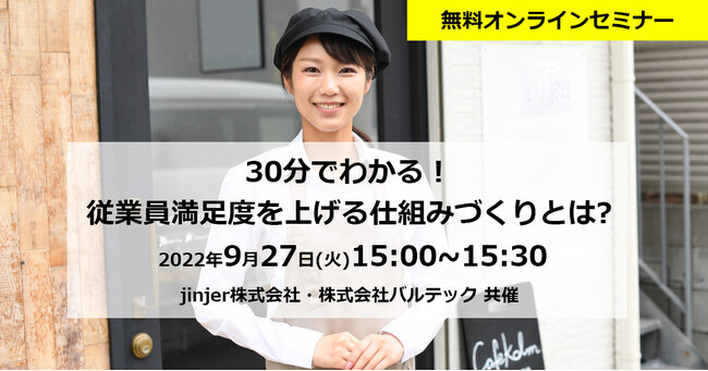 株式会社バルテック(本社:東京都新宿区。以下、バルテック)とjinjer株式会社(本社:東京都新宿区)は、9月27日(火)15:00より「アルバイト・スタッフが定着しない」悩みを抱える店舗マネージャー、人事担当者様を対象に『30分でわかる!従業員満足度を上げる仕組みづくりとは』WEBセミナーを開催いたします。