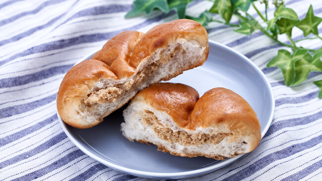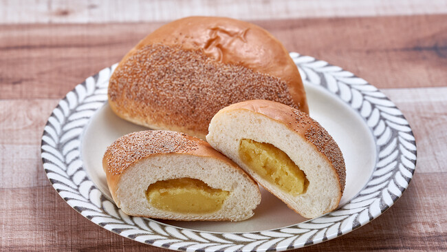 マロン餡を包んだ栗あんぱんです。生地表面に、けしの実をつけることで、見た目も栗のように仕上げました。