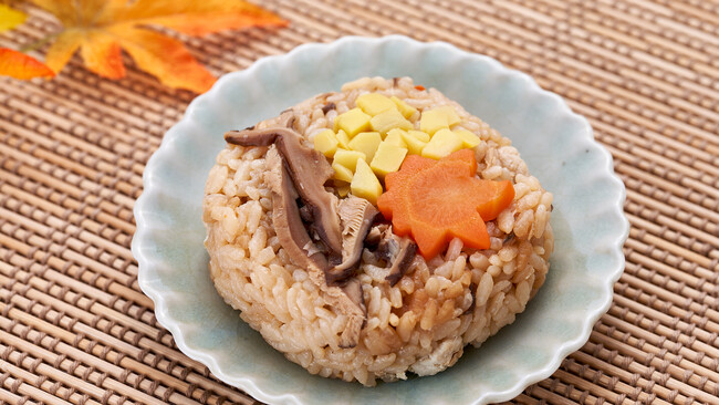 鶏五目ご飯に栗、椎茸煮、もみじ人参を彩りよくトッピングしました。