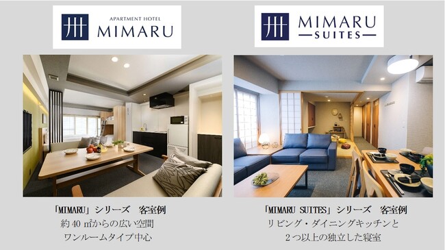 「MIMARU」は、みんなで泊まる「み(んなで泊)まる」が名前の由来。アクセスの良い都市部に立地し、約 40 平方メートル からの広い客室にキッチンやリビング・ダイニングスペースを備えた、多人数での滞在やインバウンドニーズに対応する都市型アパートメントホテルです。2021年に京都四条に誕生した新シリーズ「MIMARU SUITES」は、全室 2 ベッドルーム以上のスイートタイプで構成されています。大人グループや多世代旅行、欧米ファミリーなど、区切られた個室を求めるゲストにも対応できるよう、客室にリビング・ダイニングと2つの独立したベッドルームを設けました。家族や友人、趣味の仲間と、街や客室内リビング空間で共に楽しみながら、それぞれでくつろぐ時間も大切にできます。
