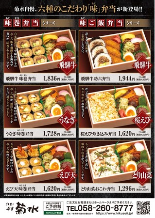 岐阜県にある株式会社偕拓堂サービスが運営する「仕出しお弁当 菊水」は、飛騨牛助六寿司や桜えび炊き込みご飯などの「味ご飯弁当」シリーズ、えび天やうなぎなど濃厚な旨味の食材を味付けおこわ飯と海苔で巻いた「味巻(あじまき)弁当」シリーズ、計6種類を「味」弁当として新発売します。