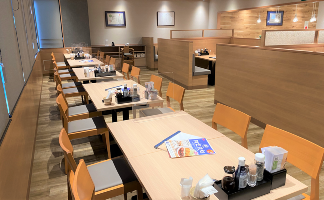木のぬくもりが感じられる落ち着いた雰囲気の店内はカウンター10席、テーブル席62席の全72席。広々とした店内で解放感があり、ゆっくりとくつろぎながらお食事が楽しめます。また、全席タブレット端末によるセルフオーダーシステムやクレジットカード決済可能なセルフレジを導入しておりお客様と従業員の安心・安全の為、対面サービスをできる限り少なくしております。