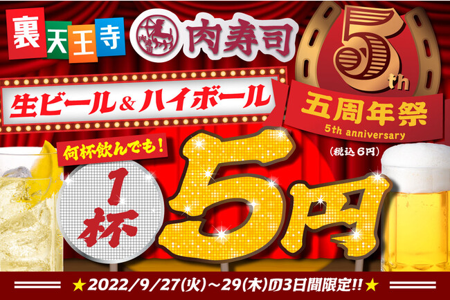 2022年9月27日(火)~29日(木)の3日間、生ビールとハイボールを何杯飲んでも、1杯5円(税抜)で提供する5周年記念キャンペーンを実施いたします。