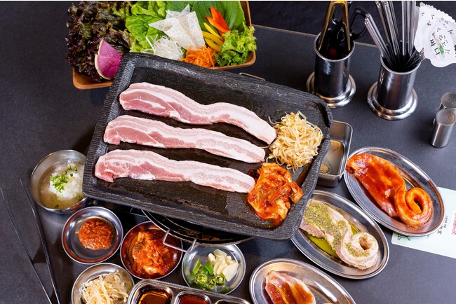 10種類の新鮮野菜でお肉を包んで、こだわりの特製タレ[m1] に付けて食べるサムギョプサルをはじめ、本場韓国の牛プルコギ鍋オルチャンプルコギやタッカルビ、自家製デザート、韓国ドリンクなど種類豊富なメニューを取り揃えています。お子さまにも喜んでいただける屋台メニューもあり、ファミリーにもお楽しみいただけると考えております。