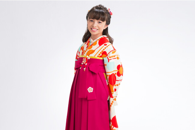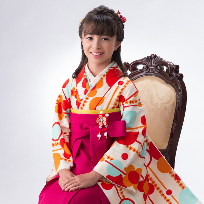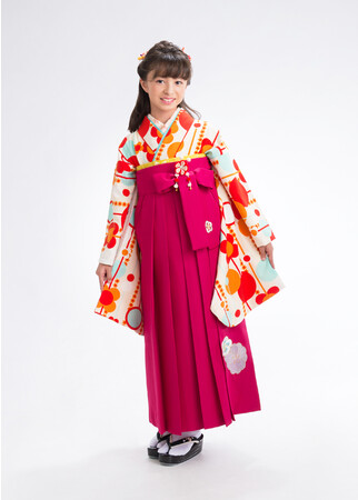 ポップなレトロフラワーと縞柄がキュートな『グランジュール』オリジナルデザインの着物と、 “ねじり梅”のワンポイント刺繍が裾と紐端にあしらわれたローズピンクの袴をコーディネートした華やかな一枚。