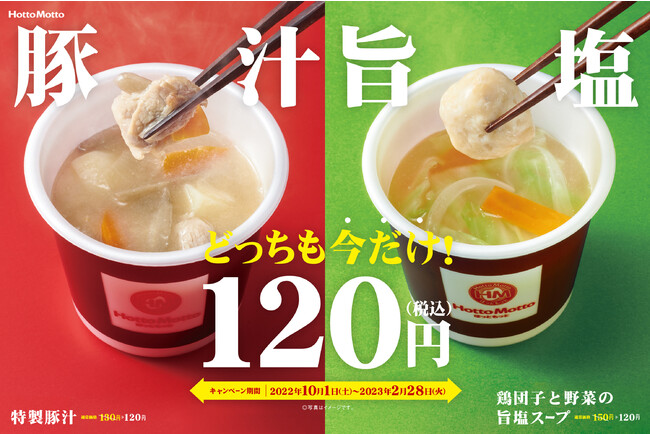株式会社プレナスは、持ち帰り弁当の「Hotto Motto (ほっともっと)」を、2022年8月末現在、2,472店舗展開しております。このたび「ほっともっと」では、年間約2,400万食販売※1の人気サイドメニュー『特製豚汁』と今年4月より販売中の『鶏団子と野菜の旨塩スープ』の2商品を期間限定の120円で提供するキャンペーンを、10月1日(土)より2月28日(火)まで開催いたします。