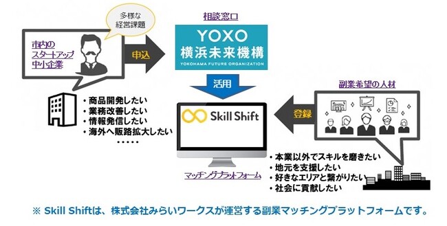 横浜市は、横浜市イノベーション人材交流促進事業として、市内のスタートアップや中小企業の副業・兼業人材を活用した経営課題解決を支援しています。このたび、副業・兼業人材活用の無料相談窓口に加えて、新たな取組として副業マッチングプラットフォーム『Skill Shift』を活用して副業・兼業人材を募集・採用できるマッチングサービスを開始します。