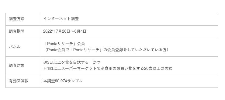 共通ポイントサービス「Ponta(ポンタ)」を運営する株式会社ロイヤリティ マーケティング(本社:東京都渋谷区、代表取締役社長:長谷川 剛、以下「LM」)は、週3日以上夕食を自炊する、かつ月1回以上スーパーマーケットで夕食用のお買い物する方を対象に、夕食の献立の実態を聴取した「夕食の献立に関する調査」(実施期間:2022年7月28日~8月4日)の結果をご報告いたします。