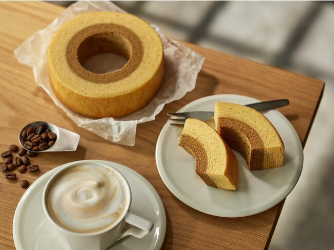 華やかなカフェラテの薫りをシンプルに愉しめる、丁寧に焼き上げた上品なバームクーヘンです。しっとりとした生地に、ほどよい苦味とやさしい甘味をとじ込めました。