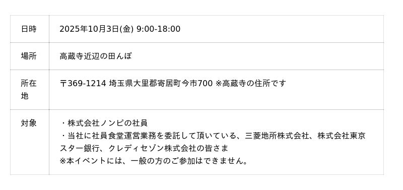 当社では、米価高騰が続く中、10月3日(金)に、埼玉県寄居町にて収穫体験イベント「収穫祭」を開催します。本イベントは、東京発の循環型農業「循環米プロジェクト」の一環として実施するもので、「社員食堂で出たコーヒーかすを堆肥化し、米を育て、再び社員食堂で提供する」という循環の第一歩として、田植えを体験を行います。