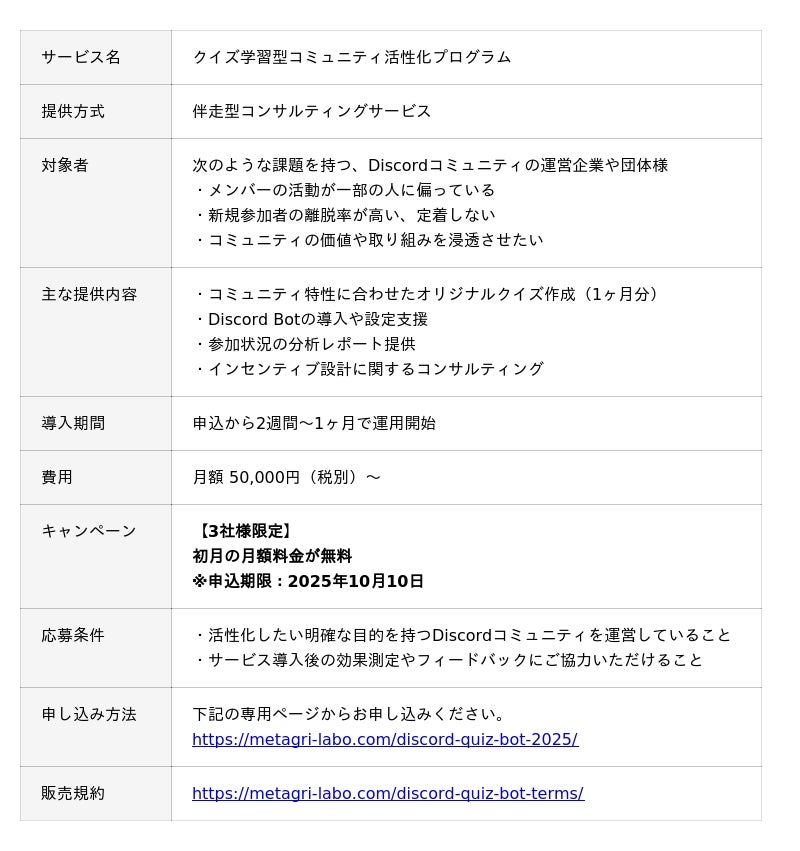 農業×新技術を推進するコミュニティ「Metagri研究所(運営:株式会社農情人)」は、Discordコミュニティの「重要情報が埋もれる」「新規参加者が定着しない」といった課題に対し、クイズBotを活用して解決に導く「クイズ学習型コミュニティ活性化プログラム」の提供を開始します。
