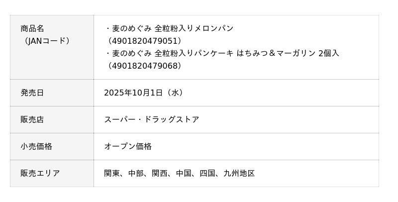 敷島製パン株式会社(Pasco)は、「麦のめぐみ」シリーズの新商品として「麦のめぐみ全粒粉入りメロンパン」「麦のめぐみ全粒粉入りパンケーキ はちみつ&マーガリン 2個入」を、2025年10月1日(水)から関東、中部、関西、中国、四国、九州地区にて発売します。