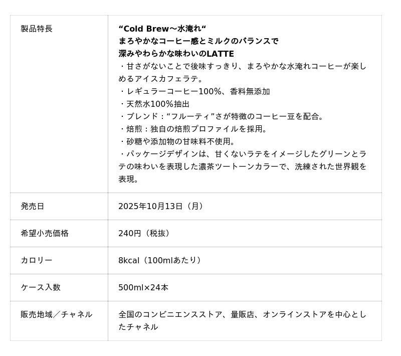 本製品は、甘さがないことですっきりとした後味とまろやかな“水淹れコーヒー”の味わいが楽しめるアイスカフェラテです。フルーティさが特徴のコーヒー豆を配合し、独自のプロファイルで焙煎、水淹れすることで、すっきりまろやかなコーヒーに仕上げています。牛乳と合わせることで、ラテユーザーも満足するコーヒーとミルクの満足感が両立した味わいを実現しました。砂糖や甘味料(添加物)を使用していないため、べたつかず、後味までコーヒーの風味を楽しめるラテだからこそ、心地よくリフレッシュできます。パッケージデザインは、甘くないラテをイメージしたグリーンとラテの味わいを表現した濃茶のツートーンカラーで、洗練された世界観を表現しました。