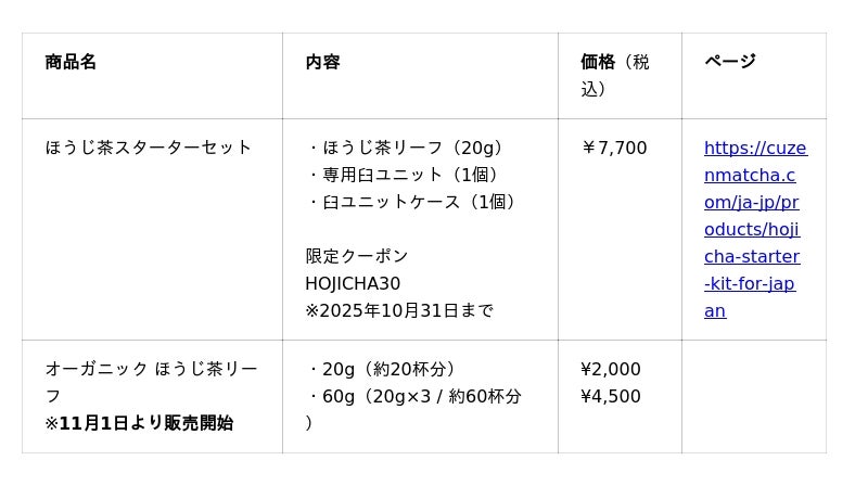 挽きたての抹茶を世界に届ける「CUZEN MATCHA(読み:くうぜんまっちゃ)」を運営する World Matcha株式会社(本社:米国カリフォルニア州サンマテオ、日本法人:東京都目黒区)は、抹茶マシンでほうじ茶を挽いて淹れることができる「ほうじ茶スターターセット」を2025年9月29日(月)に発売開始いたします。また販売を記念して、10月31日まで料金が30%OFFになる期間限定クーポンを発行します。