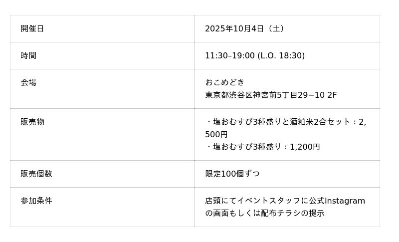 会場は、お米の魅力を追求するニッポンバーガー専門店「おこめどき」の2階スペースをお借りし、おむすびシェフがライブキッチンで握る3種の塩おむすびを販売します 。普段は市場に出回ることのないこの希少な「酒粕米」を、オフラインで実際に味わっていただき、その物語と美味しさを直接お届けします 。