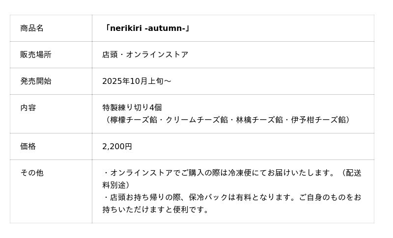 また、特製練り切りの秋の詰め合わせ商品「nerikiri -autumn-」も、オンラインストアでの全国販売を10月上旬より販売開始いたします。