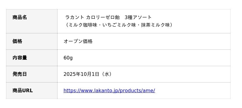 当製品は、カロリーゼロの植物由来甘味料「ラカントS」開発の中で培った技術により、これまで実現が難しいとされてきた“カロリーゼロの飴”を2008年に日本で初めて発売。カロリー・ロカボ糖質(※1)ゼロ。甘味には「ラカントS」に使用されている「高純度羅漢果エキス」を配合し、植物由来の自然な甘みが感じられます。これまでに様々な味を販売し、「つい間食を食べ過ぎてしまう」「口さみしいときに食べるものがない」「食事制限をしていて、甘いものを食べられず辛い」、そんなカロリー・糖質コントロールをされている方から、ダイエットユーザーの方まで、多くの方にご愛顧いただいております。