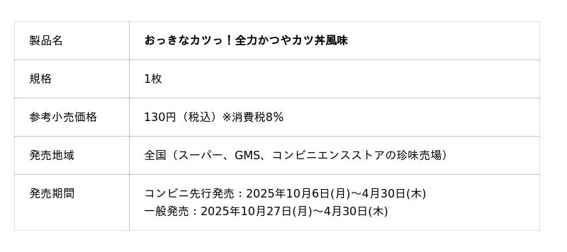 株式会社なとり(本社:東京都北区 会長兼社長:名取三郎)は、「おっきなカツっ! 全力かつやタルタルチキンカツ風味」を10月6日(月)より期間限定で新たに発売いたします。
