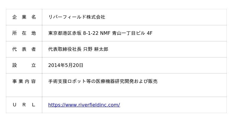 リバーフィールド株式会社は、「大学研究室で培われた技術で社会的課題の解決と新しい価値の創出を」を理念に掲げ、遠隔操作型手術支援ロボット等の開発を手掛ける、東京工業大学および東京医科歯科大学(現、東京科学大学)発のスタートアップ企業です。