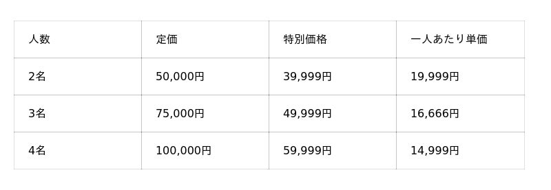 費 用: 特別価格 2名様39,999円/3名様49,999円/4名様59,999円