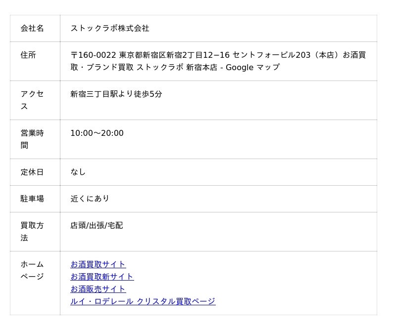 お酒買取専門店ストックラボのルイ・ロデレール クリスタル買取の特徴を3つに分けて解説します。まずは、ストックラボの業者の概要をご確認ください。
