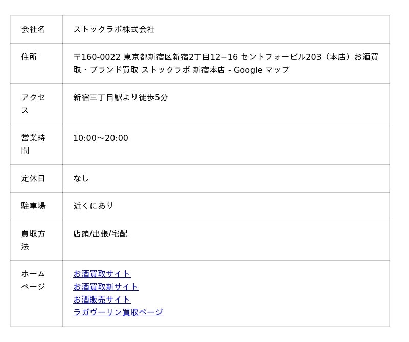 お酒買取専門店ストックラボのラガヴーリン買取の特徴を3つに分けて解説します。まずは、ストックラボの業者の概要をご確認ください。