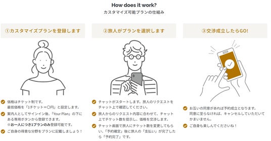 外国人観光客から寄せられたリクエストに基づき、案内人がチャット上で内容を提案・調整し、合意に基づいて予約を成立させることが可能になりました。