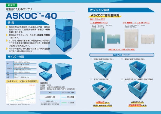 「ASKOC(TM)-40」は、冷凍・チルド・冷蔵・生鮮食品など幅広い品温管理に対応する折りたたみ式コンテナです。