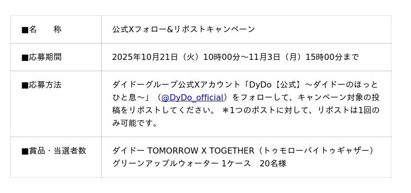 ダイドー TOMORROW X TOGETHER(トゥモローバイトゥギャザー)グリーンアップルウォーターの発売を記念して、ダイドーグループ公式Xアカウント「ダイドーのほっとひと息」をフォローして対象ポストをリポストするだけで、本商品が抽選で当たる「公式Xフォロー&リポストキャンペーン」を実施いたします。