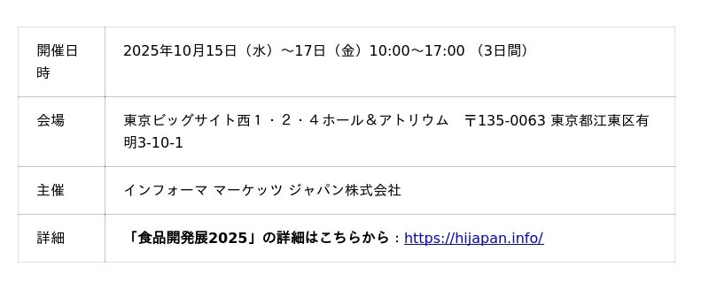 食品の企画開発をサポートするWEBプラットフォーム「シェアシマ」を運営するICS-net株式会社(本社:長野県長野市南石堂町1972、代表取締役:小池祥悟)は、2025年10月15日(水)~17日(金)に東京ビッグサイト 西1・2・4ホール&アトリウムで開催される「食品開発展2025」に合同ブースを出展いたします。ブース番号は4-177です。会場にお越しの際は、ぜひお立ち寄りください。