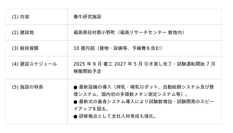 フィード・ワン株式会社(本社:神奈川県横浜市/代表取締役社長 庄司 英洋)は、養牛研究施設「いわきリサーチセンター」(福島県いわき市)を「福島リサーチセンター」(福島県田 村郡小野町)内へ移転することを決定いたしました。2025 年 9 月に工事着手、2027 年 7 月に稼働開始予定です。 搾乳・哺乳ロボットや自動給餌システム、国内初の多頭数メタン測定システム等の最新設備を導入し、環境負荷 低減への取組み強化と製品開発力強化の両立を図ります。