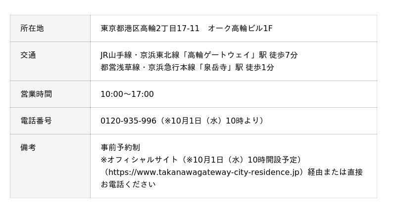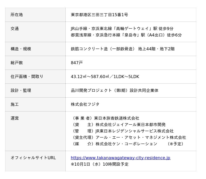 東日本旅客鉄道株式会社(本社:東京都渋谷区、代表取締役社長:喜? 陽一)、株式会社ジェイアール東日本都市開発(本社:東京都渋谷区、代表取締役社長:根本 英紀)は、TAKANAWA GATEWAY CITY内に2026年春に開業予定の高級賃貸レジデンス「TAKANAWA GATEWAY CITY RESIDENCE(以下、本物件)」の入居を希望される方への情報発信拠点として、インフォメーションサロンを2025年10月1日(水)に開設します。サロンの運営は、外資系企業社員や経営者などエグゼクティブ向けの高級賃貸仲介に強みを持つ株式会社ケン・コーポレーション(本社:東京都港区、代表取締役社長:中川 堅悟)が行います。また同日10時より、オフィシャルサイト(https://www.takanawagateway-city-residence.jp)を開設します。