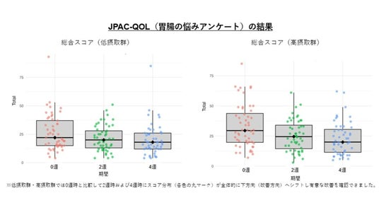 食物繊維の低摂取および高摂取グループでは2週間の摂取でJPAC-QOLスコアが有意に改善しました。また、排便のあった日数については、低摂取および高摂取グループともに4週間の摂取で有意に改善しました。