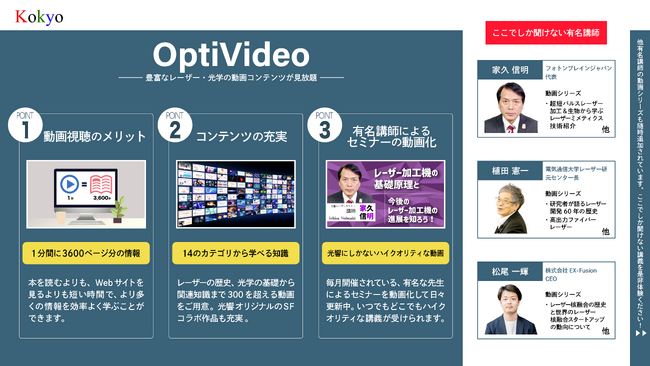 OptiVIdeoとは月額定額制でレーザー製品や光学についての専門知識を学べる動画学習サービスです。