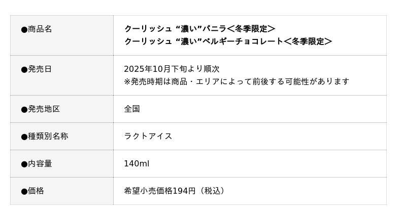 「クーリッシュ バニラ」「クーリッシュ ベルギーチョコレート」については、季節に合わせて微細氷のサイズを変えています。冬季限定品質は、春・秋よりも微細氷を小さくすることでマイルドな冷涼感と、よりなめらかな食感を楽しむことができます。また、夏季限定品質は、春・秋に使用している微細氷と比較しサイズが大きく、より強い冷涼感とシャリッとした食感が楽しめます。
