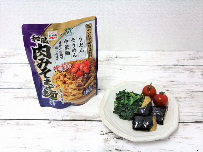 『VL和風肉みそまぜ麺の素』に野菜をトッピングしただけの簡単メニューですが、バランスもよくなり、食べ応えもアップ!一気に豪華なまぜ麺が完成します。食べた瞬間に、鰹節の旨みと香りがふわりと広がり食欲をそそりますよ。暑い日には、うどんを冷水でしめれば爽やかに。肌寒い日は、茹でたままでほっこり温かく。気温の変化にも対応できるメニューです。
