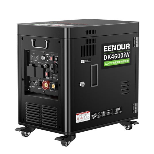 EENOUR初の発電・溶接一体機「DK4600iW」。1台で電源供給と溶接作業の両方に対応でき、機材を複数用意する手間や設置スペースを削減します。発電は100V・最大出力3,500Wに対応。静音構造により稼働音は約59dBと低く、従来の開放型モデルより静かで扱いやすい仕様です。
