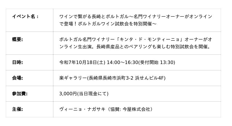 かつてポルトガルの船が降り立ち、異国の文化と出会ったこの長崎の地で、ワインの魅力、ポルトガルの話、そして長崎への想いを海を越えてお届けします。丹精込めて丁寧に造り上げられたワインを一緒にテイスティングし、ポルトガルをもっと身近に感じる特別な時間をお過ごしください。